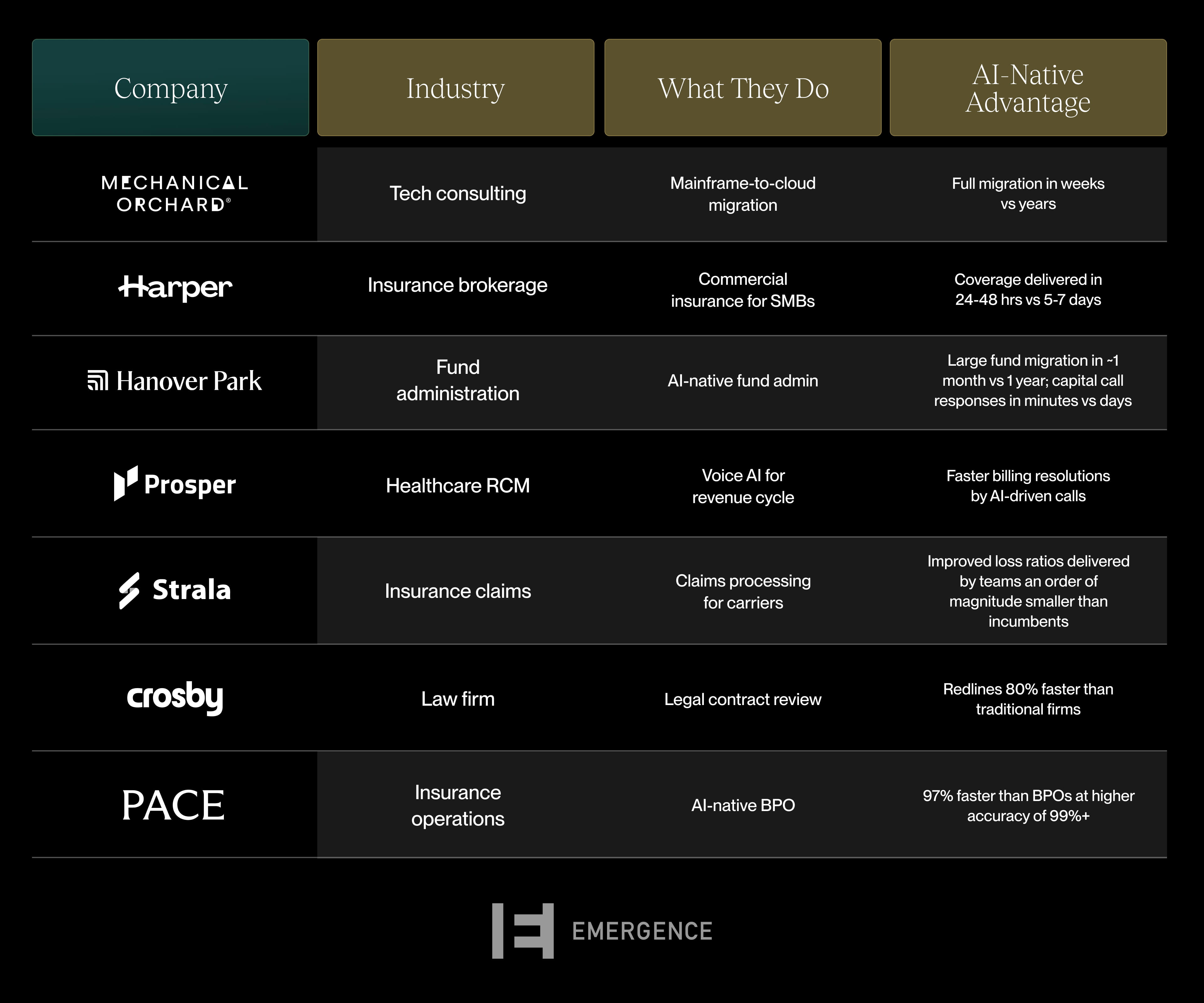 Since then, the opportunity has only come into sharper focus. The market is no longer waiting for tools; it is demanding results. Insurance brokerage is being rebuilt by Harper. Tech consulting is being disrupted by Mechanical Orchard. Fund administration is being rethought by Hanover Park. Big law is being reimagined by companies like Crosby Legal. Healthcare revenue cycle management is being transformed by Prosper AI.